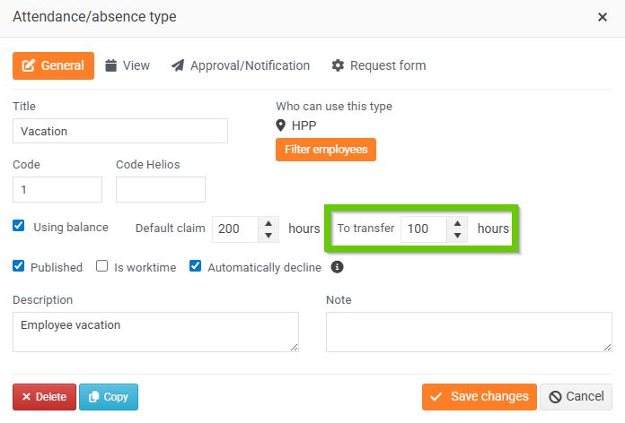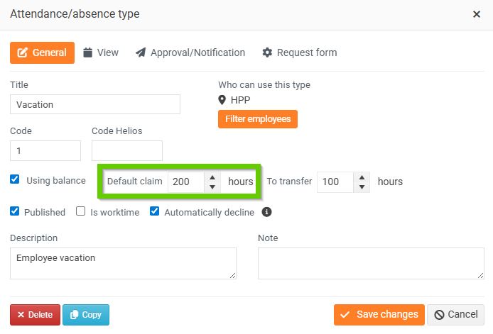 - Default entitlement (attendance/absence type) – balances for all employees are pre-filled uniformly with the value set for a specific absence type in the Default entitlement field (you can find this setting in the attendance/absence type details on the General tab).