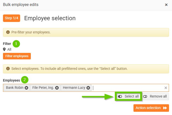 - Select employees - you can use all pre-filtered ones (using the "Select all" button) or narrow their selection further.