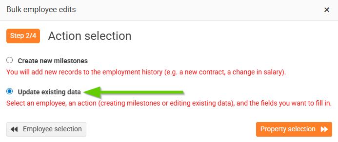 Bulk data editing allows you to edit work and personal data in existing records for multiple employees at once.