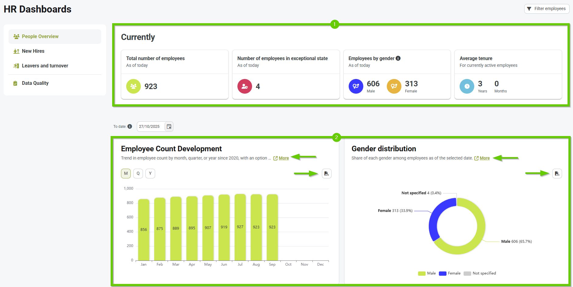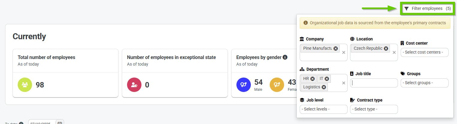 By default, dashboards display data for all users in the system who have their tab set to be included in the statistics . You can further filter these users using the Filter Employees button on each dashboard. After clicking, enter the parameters to search for the desired records. The filter allows you to select multiple values for a single parameter.