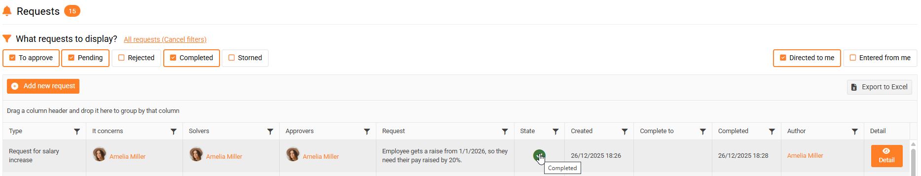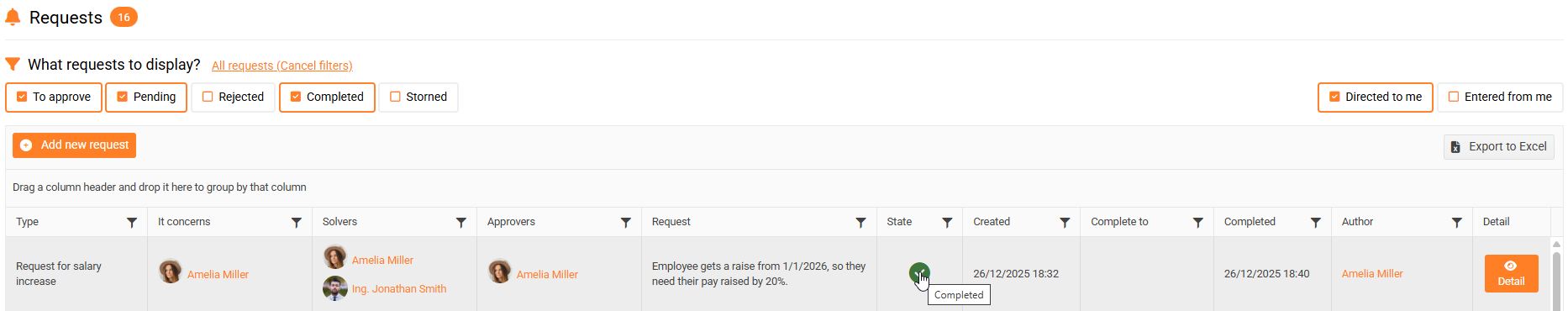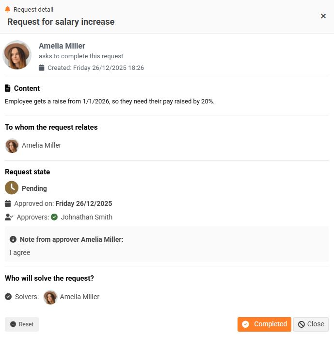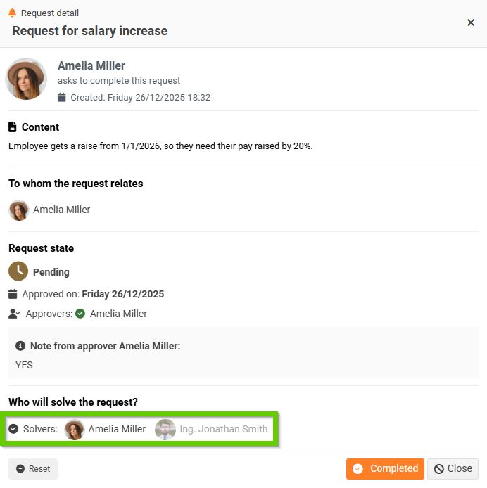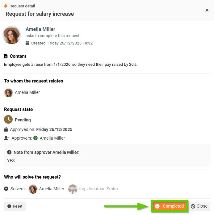 When the solver resolves the request, they click the Completed button. A window will appear where they can enter their comment (optional) and confirm completion.