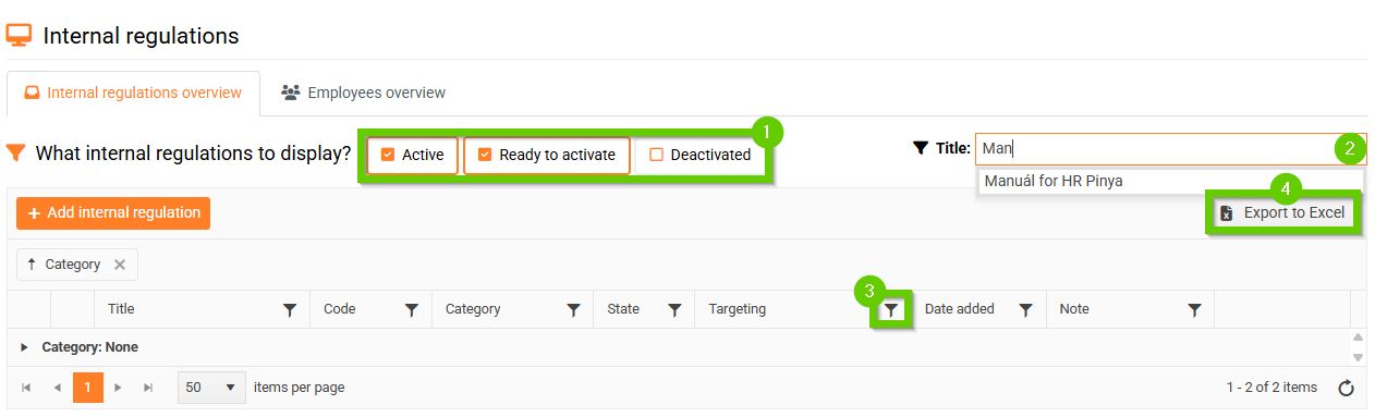 - field for searching by name (2) - the field has a so-called hint function (start typing text and the function will automatically offer you suggestions for already existing words or phrases contained in the name of the internal regulations)