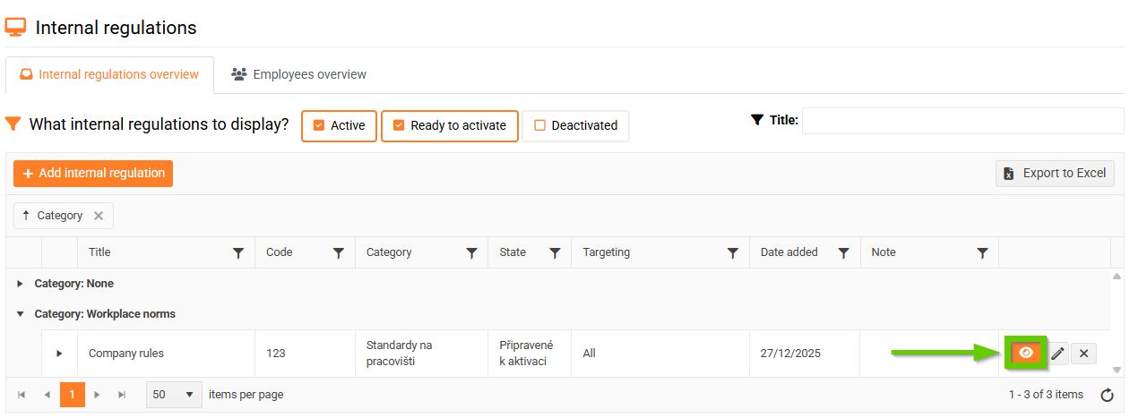 By default, the internal regulations overview displays only records that are either in the Active or Ready to activate status.
