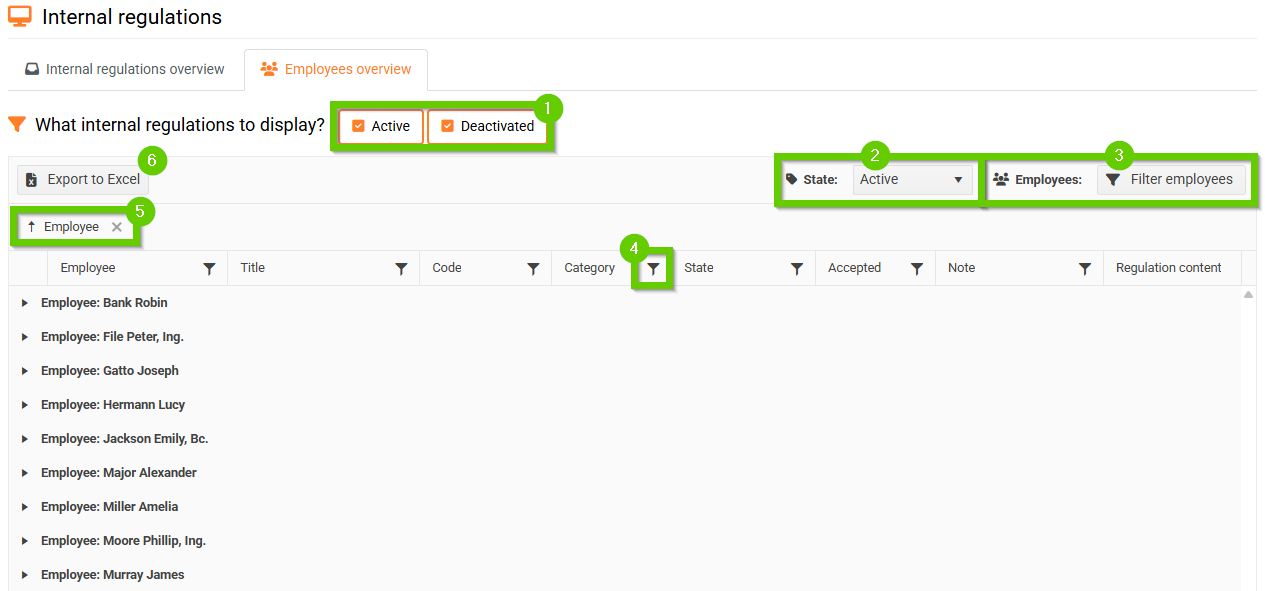 - grouping (5) - any column in the internal regulations overview can be dragged over the column headers to group internal regulations, for example by Category