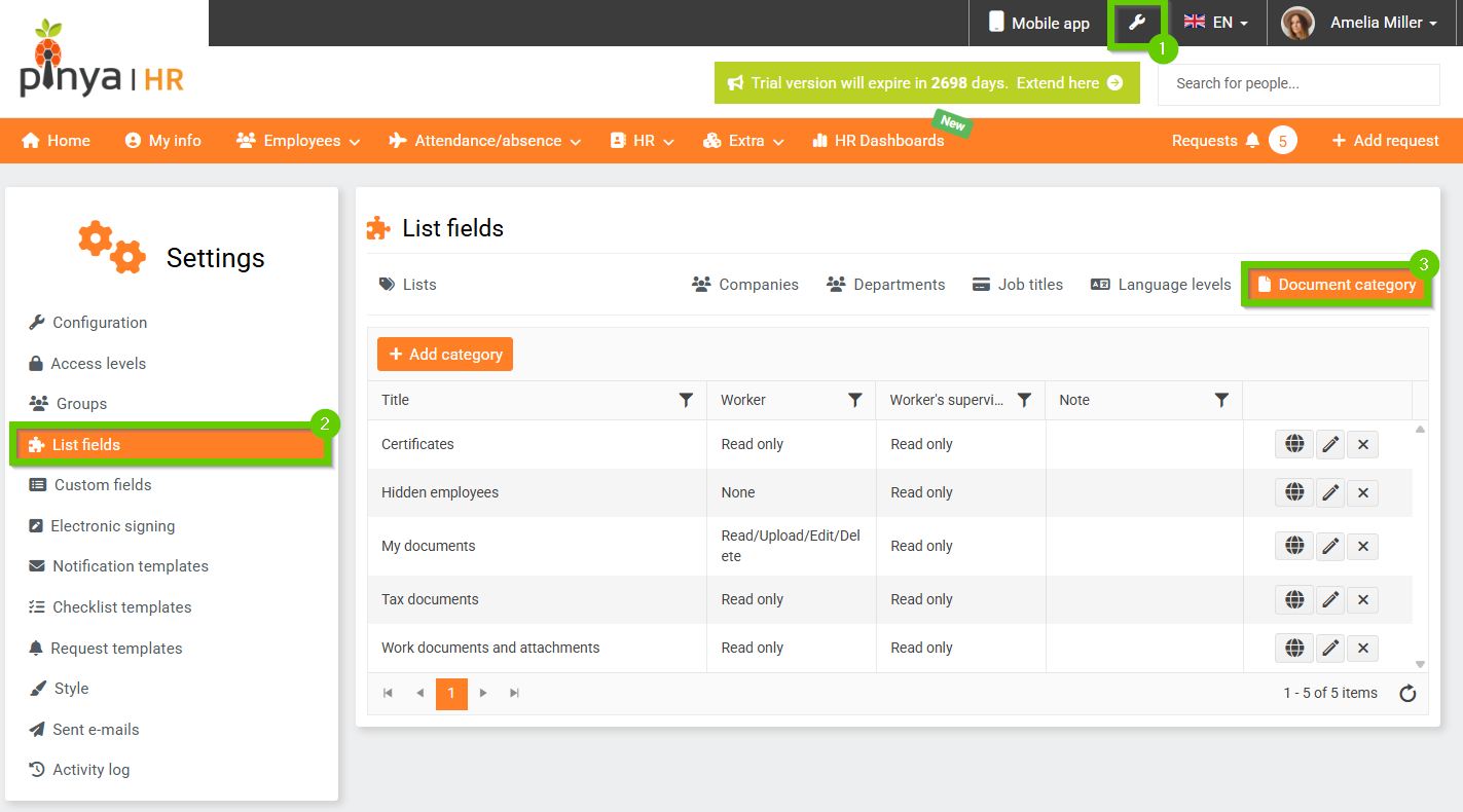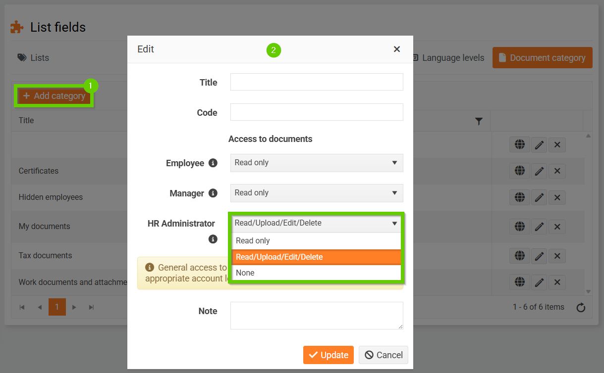 To add a new category, click the Add category button. In the window that appears, fill in the category name (required field). You can also set access permissions for employees, supervisors, and HR administrators here: