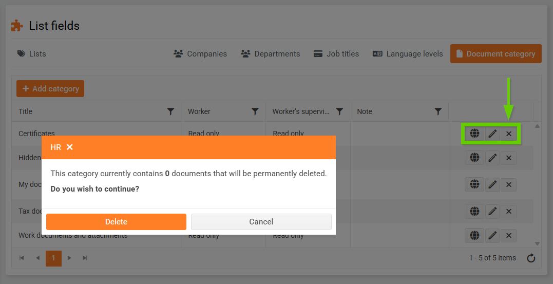 You can edit the selected category by clicking the pencil icon and delete the category by clicking the cross icon . If you decide to delete a category, notification will appear showing how many documents are contained in that category.