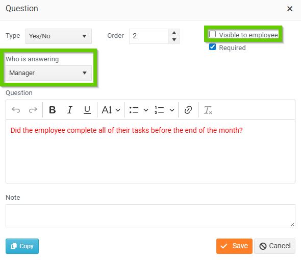 - For a manager - on the Question form, fill in the required fields. In the Who is responding field, select Manager. The Visible to employees checkbox may or may not be checked. Then save the form.