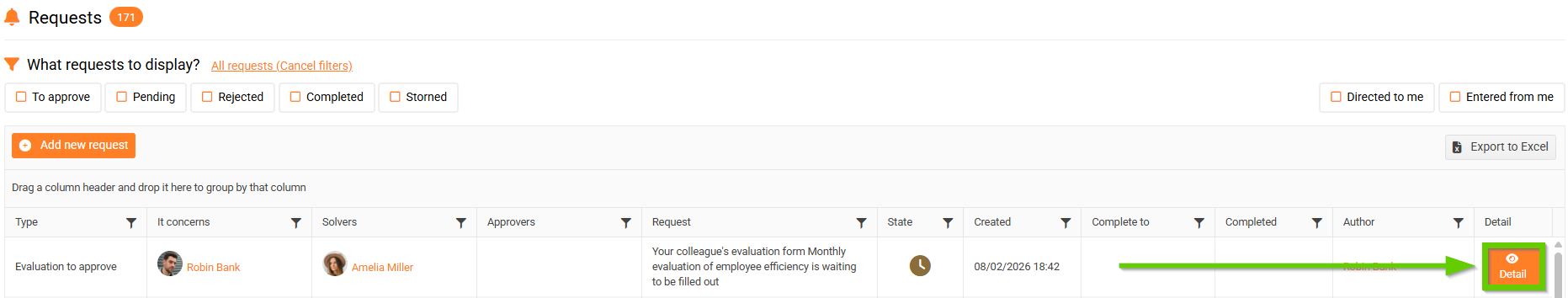 - At the same time, a request for the manager to complete the evaluation is automatically created. Clicking the Detail button opens the request details.