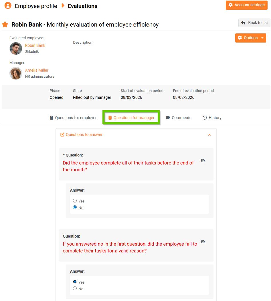 - Here, on the Questions for Employees tab, the manager can see how the employee answered, but has no way of interfering with them.