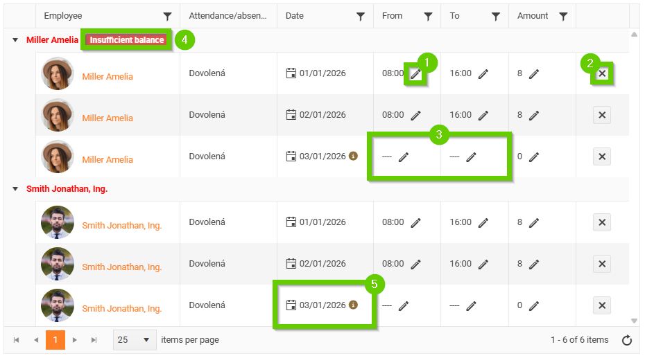 If the selected employee does not have sufficient vacation balance, a red warning will appear next to their name (4).