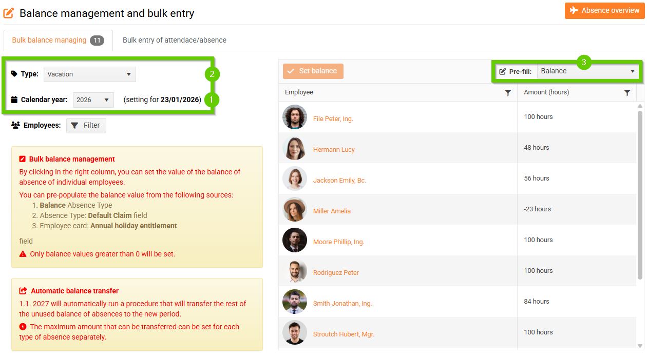 When managing the balance, it is important to select the correct year (1) and absence type (2) for which the balance is being set.