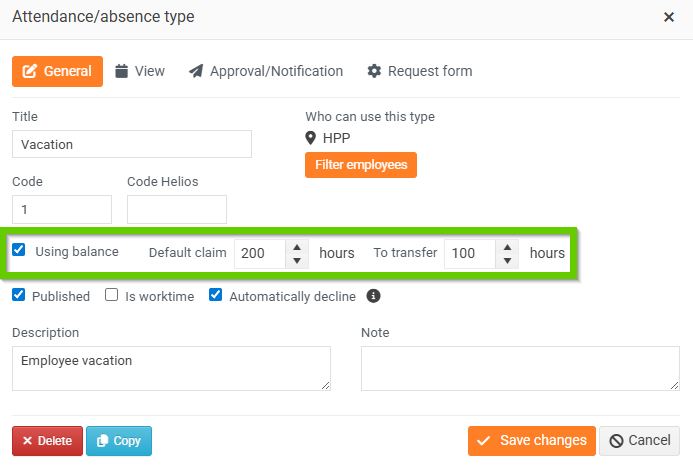 - Balance: the current amount of the absence balance (1)