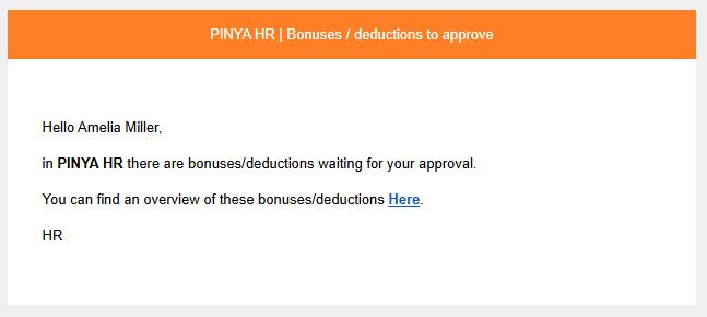 If bonuses/deductions are approved by multiple approvers in a predetermined order , after sending for approval, the first approver will receive an email notification that bonuses/deductions are waiting for him/her to approve.
