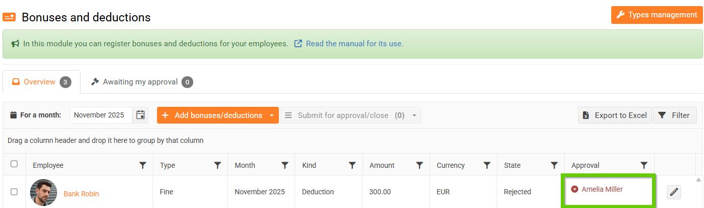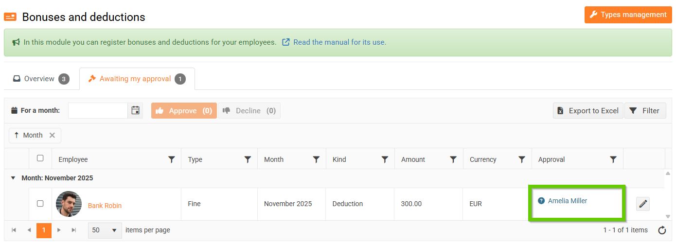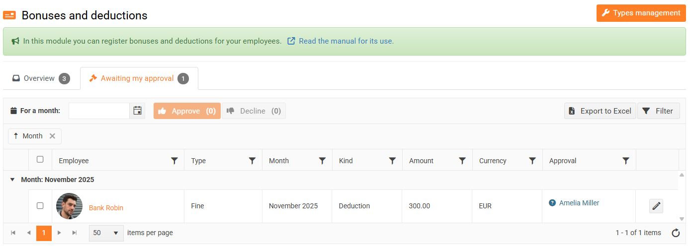 By clicking the Waiting for my approval button, they can go to the tab where they can see an overview of all deductions and bonuses for which they are entered as an approver.