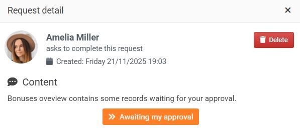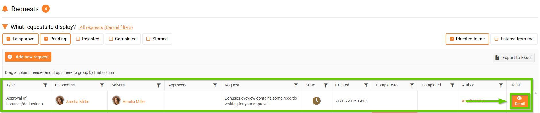 If the approver does not have any pending "Bonuses for approval" requests at the given moment, a request for approval of bonuses/deductions will be automatically created for them. Clicking the Detail button will open the request details.