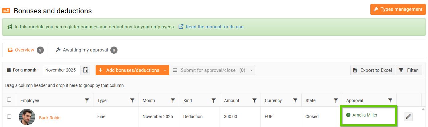 When bonuses/deductions are approved by all approvers, they are either in the Approved state (the Close after approval checkbox was not active when sending for approval) or they can be automatically closed, i.e. in the Closed state (the Close after approval checkbox was active when sending for approval).