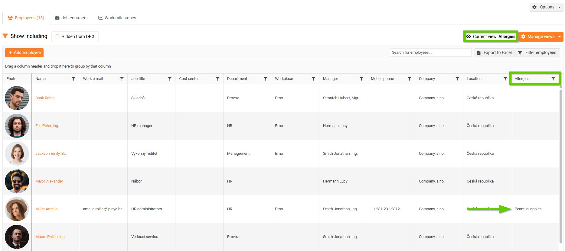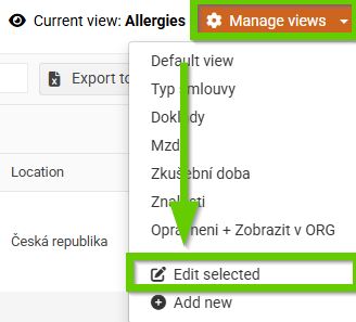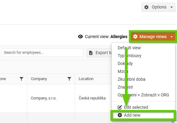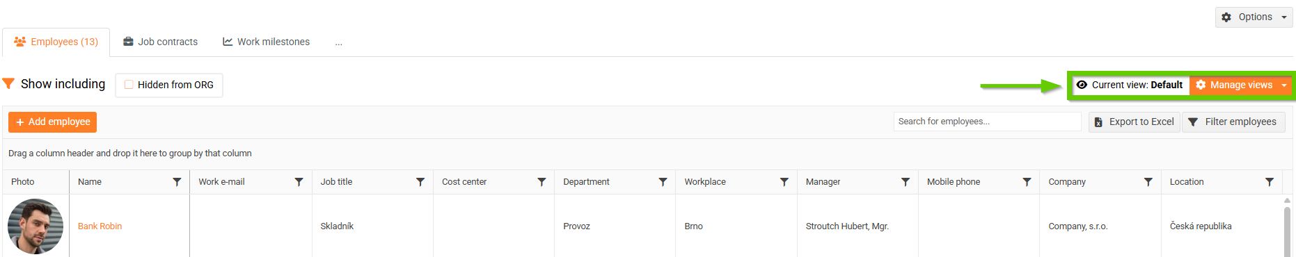 You can see information about which view is currently set in the employee list next to the Manage views button.