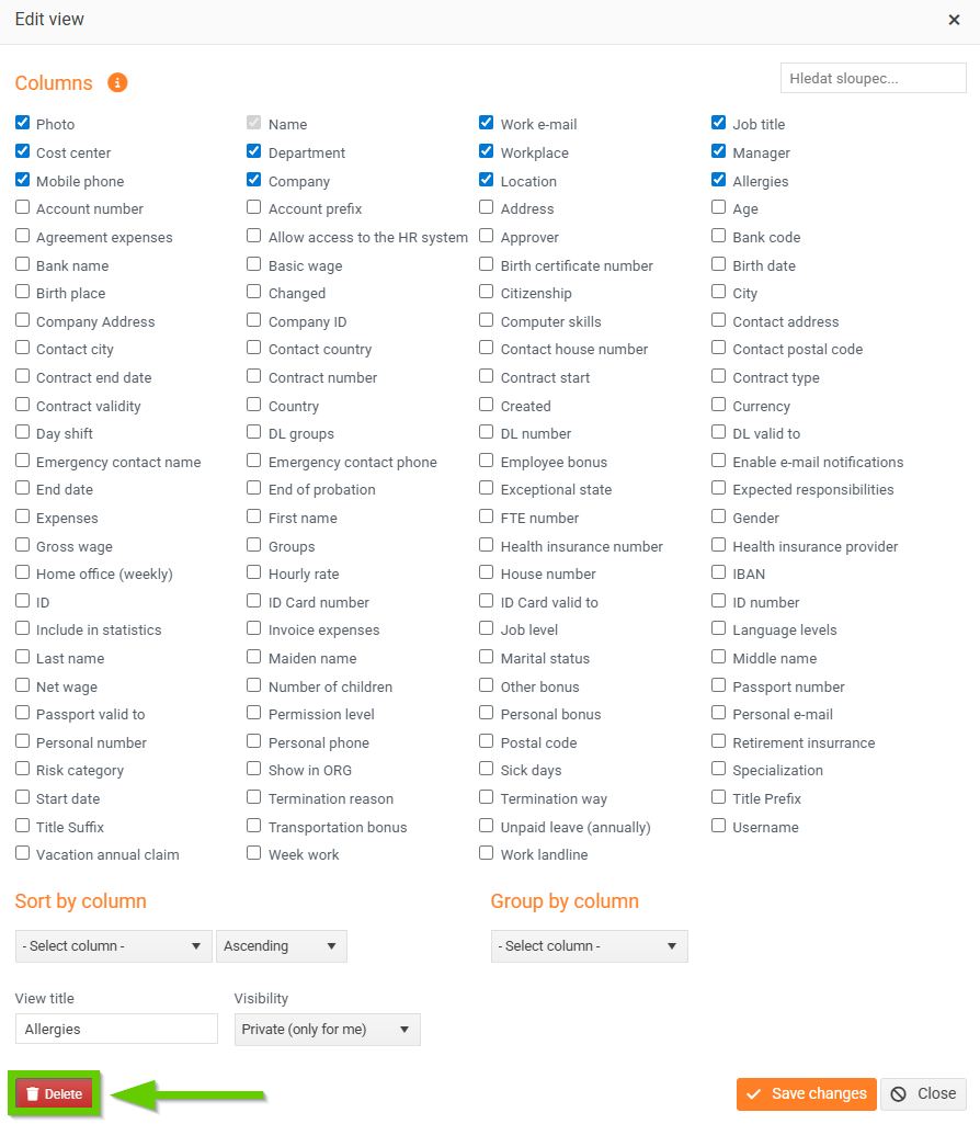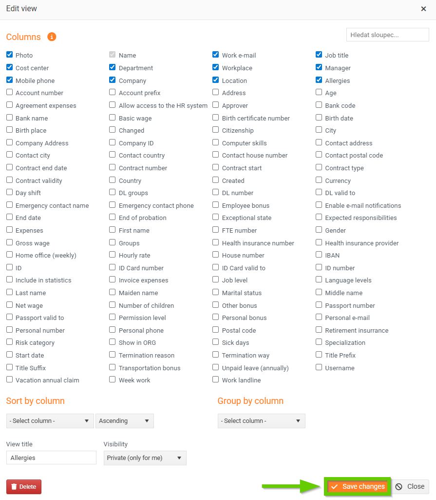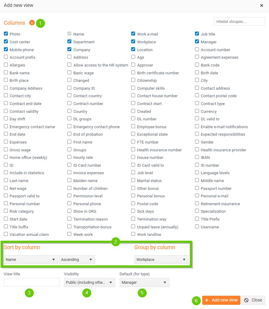 - select the columns you want to display in the employee list - the "Name" column is required and cannot be removed from any view.
