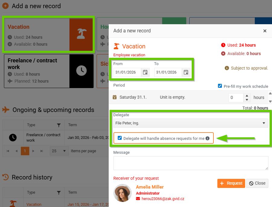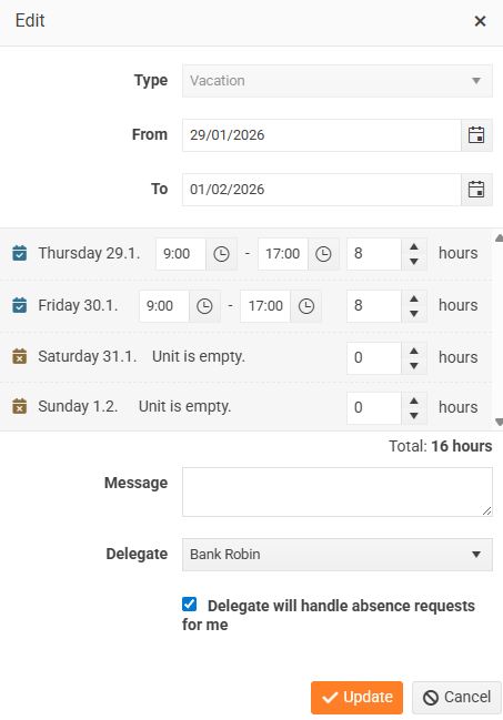 Here, select the absence type, for example Vacation, and click on it. A window will open in which you can enter the duration of the absence and select a delegate. The checkbox the delegate will handle absence requests for me will then be activated, which you must select.