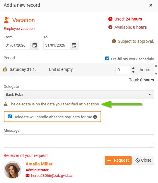 If the selected delegate is also absent at the selected time, the system will notify you.