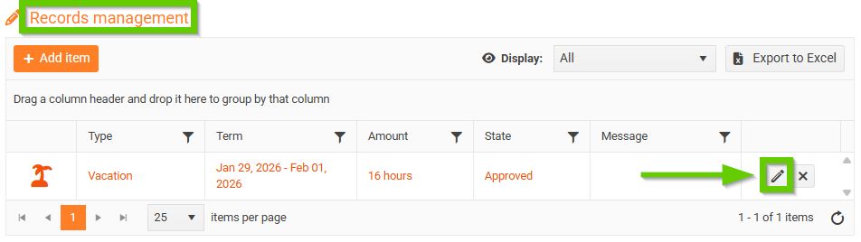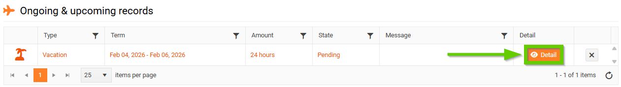 Click the Request button. The leave request will appear in the Ongoing and Planned Records section.