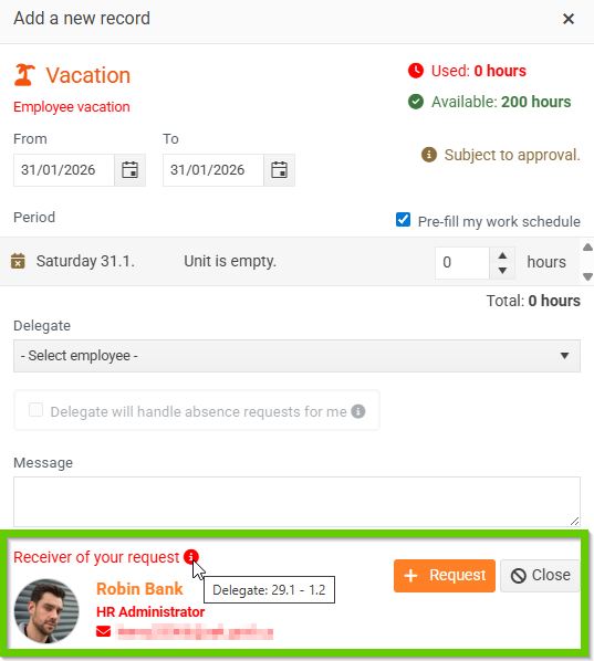 A window will open where you can enter or edit a delegate and the checkbox Delegate will handle absence requests for me. This form does not check whether the employee has a subordinate.
