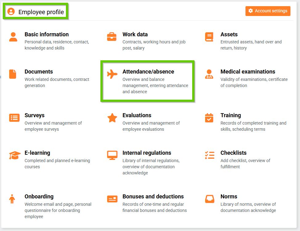 Go to Employee profile > Attendance/absence tab.