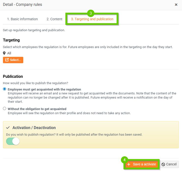 Future employees will only be included in the targeting on the day of joining.- Choose how you want to publish the regulation - whether the employee must familiarize themselves with the regulation or whether they are not required to familiarize themselves with it.