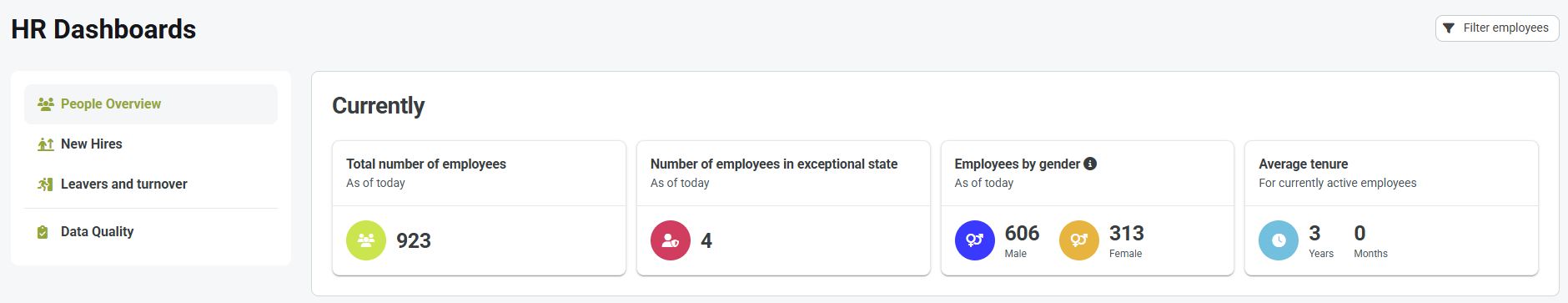 - Employees by gender - the 2 most common genders are displayed here