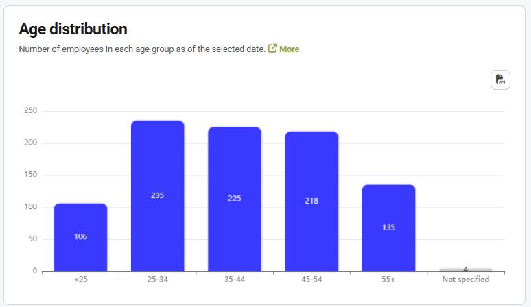 The graph shows the number of employees in each age category on the selected date.