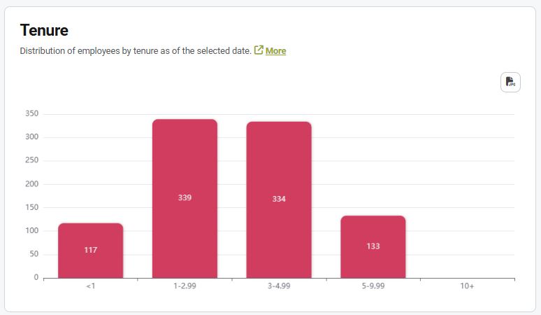 The graph shows the distribution of employees by length of service in the company as of the selected date.