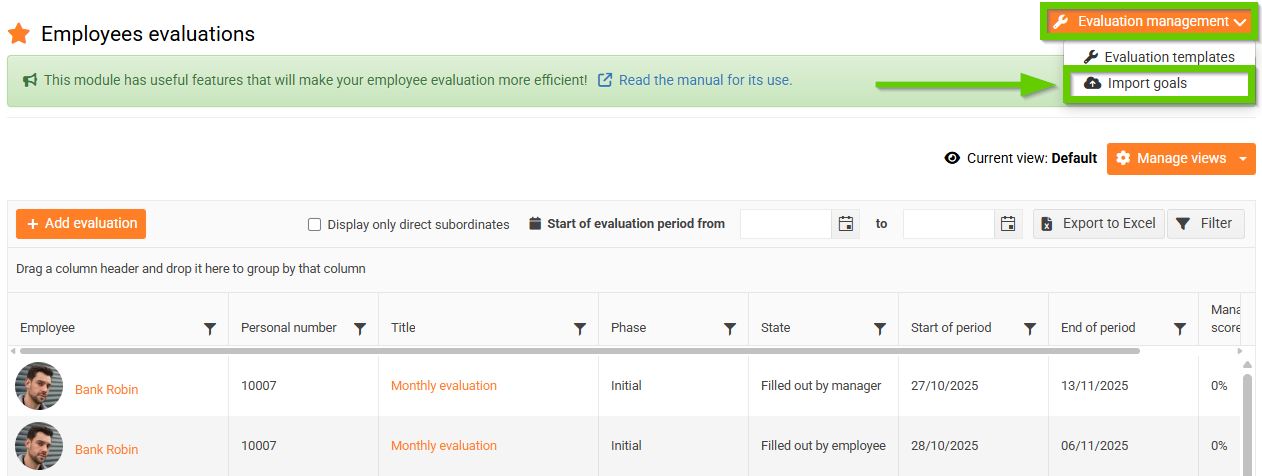 To bulk import goals, go to Employee Evaluations, click the Evaluation management button, and select Import goals.