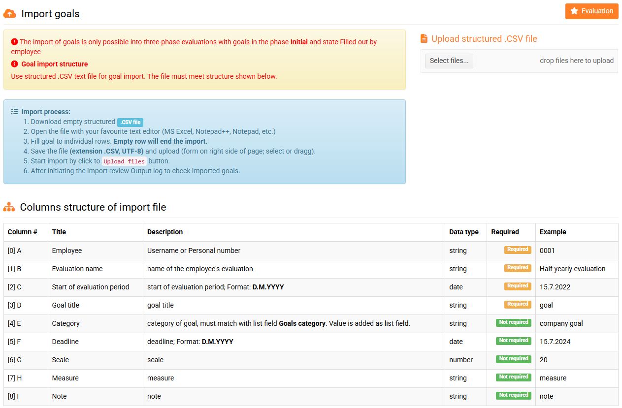 Importing goals is only available to users with the Evaluations management permission.