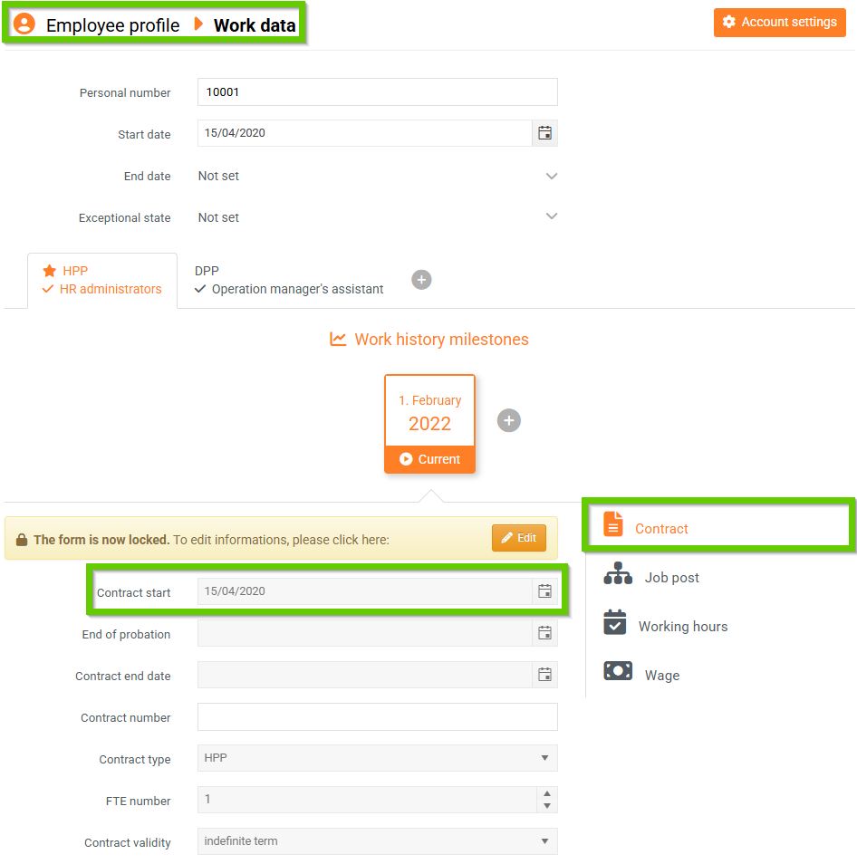 - go to Employee profile > to the Work data tab > to the Contract tab > to the Contract start field
