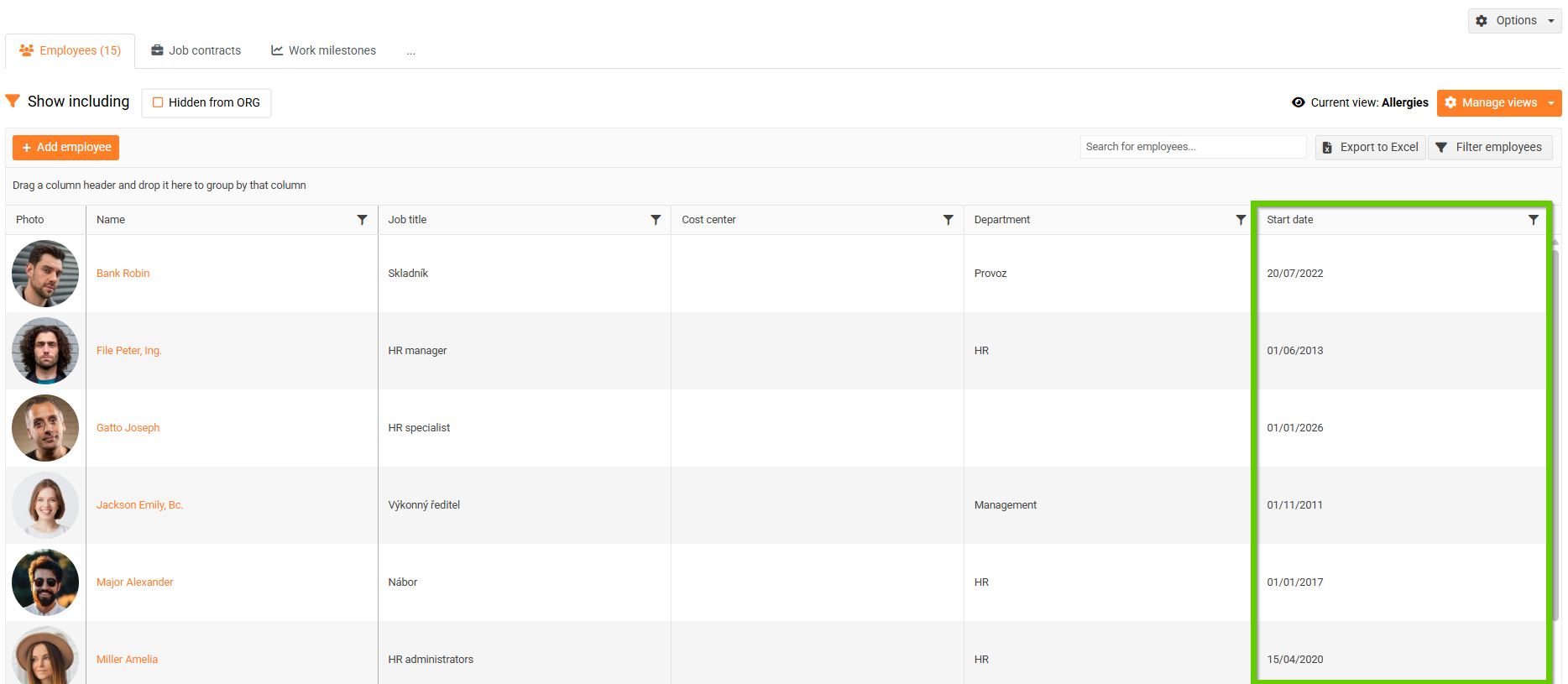 - in the main menu, go to the Employees tab > List of employees and select the view that contains the Start of employment contract column