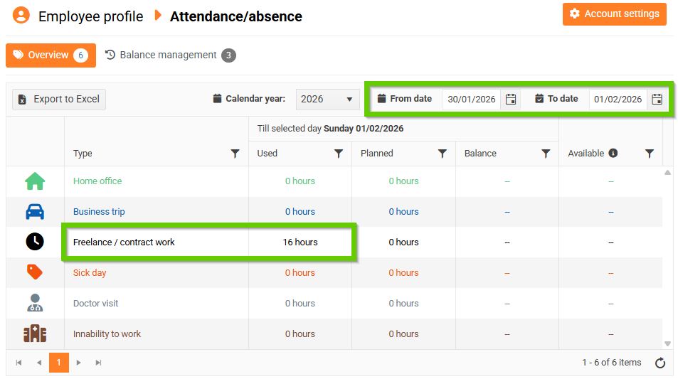 - Go to Employee profile > to the Attendance/absence tab, enter the required period in the overview, and under the attendance type DPP/DPČ Work you can see the number of hours reported for this period.