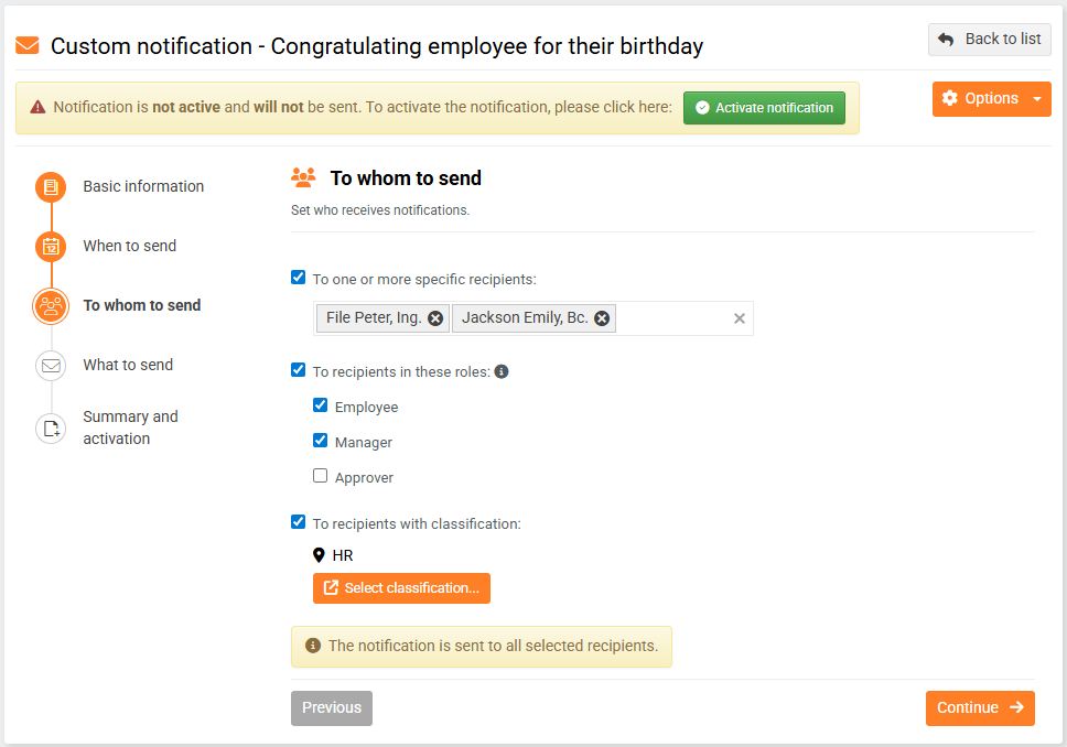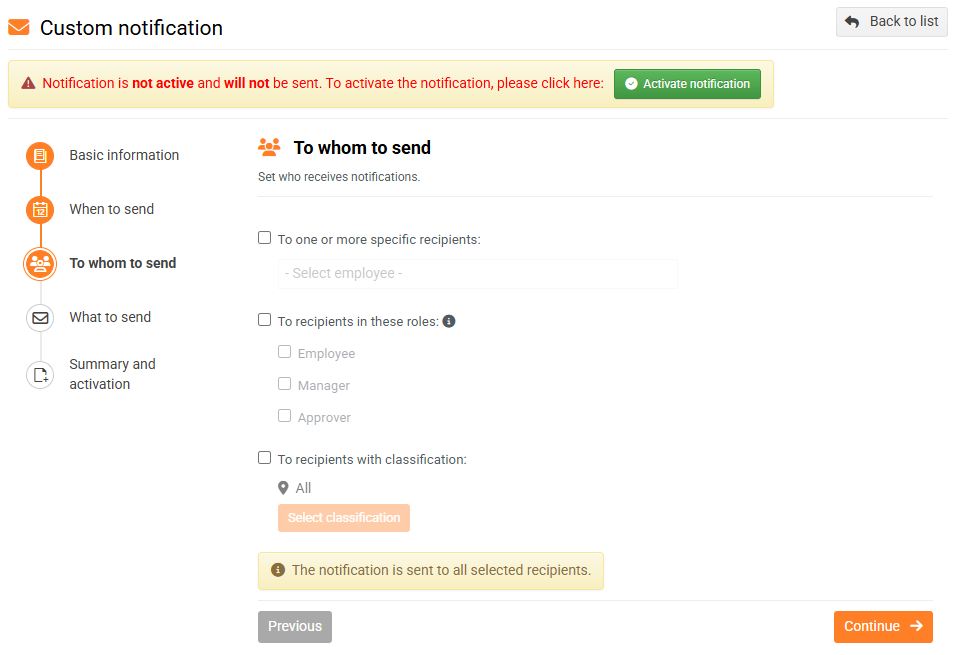- To recipients with this classification: Here you can filter recipients using Targeting - e.g. by job position, department, type of employment contract, etc.