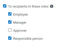 - Recipients in these roles: Roles are offered in relation to the employee to whom the notification applies. You can therefore select the directly affected employee or their supervisor or approver as the recipient.