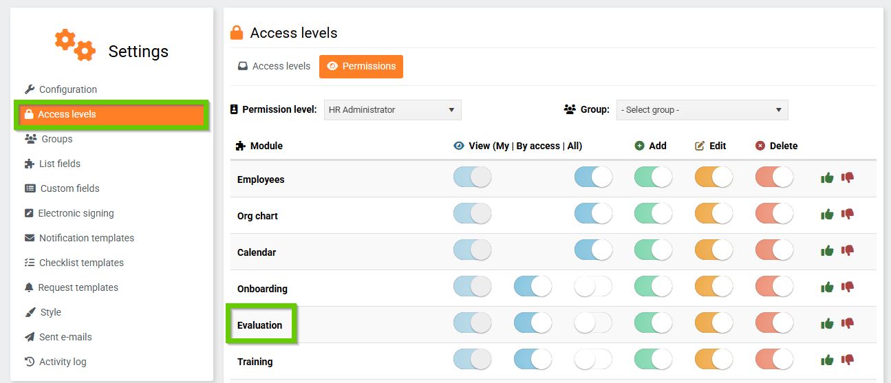 Settings > Access Levels > Permissions tab > Evaluation module.