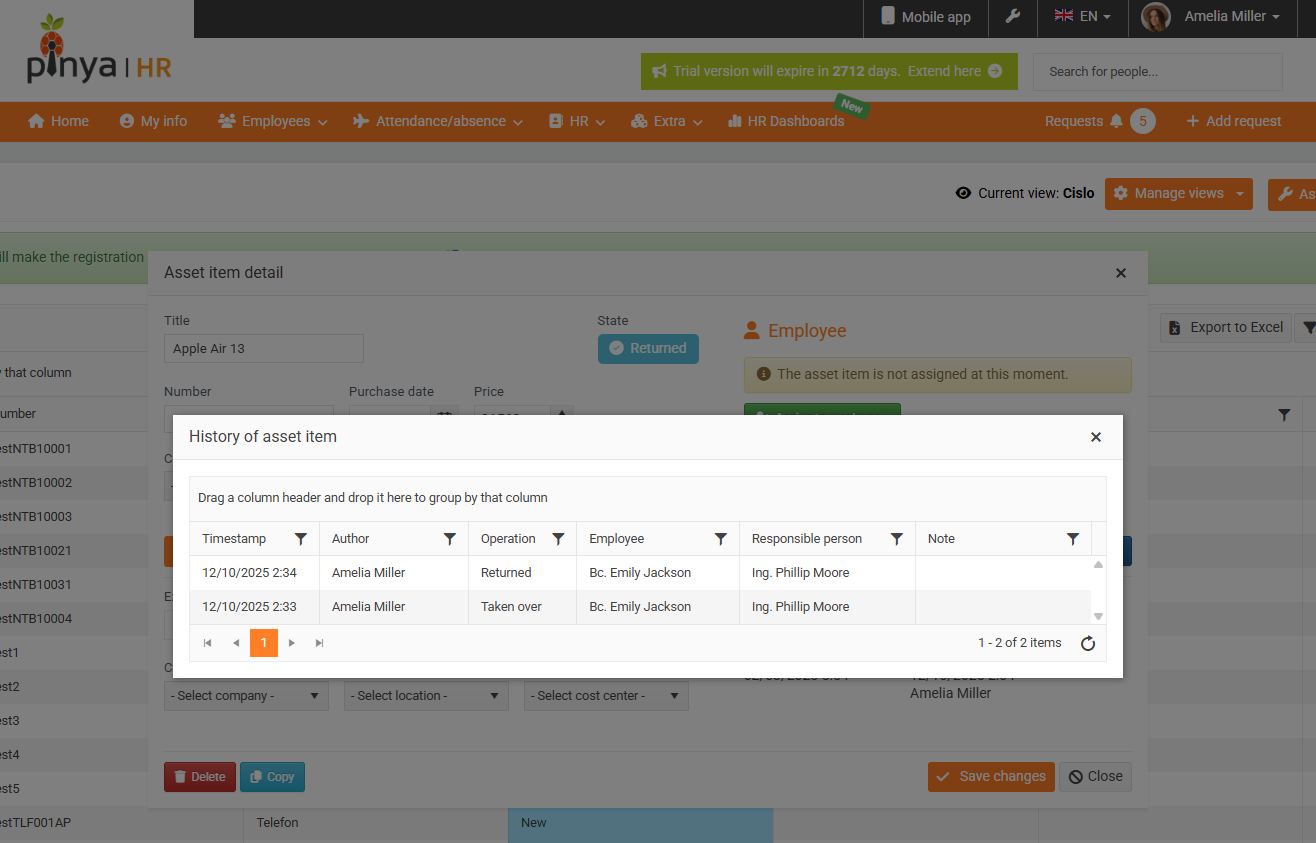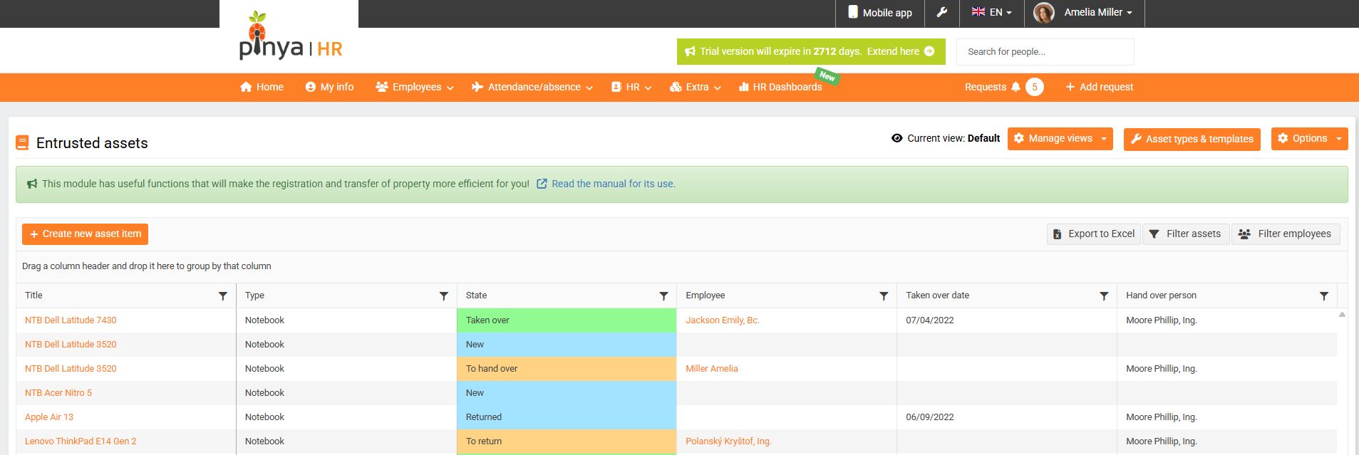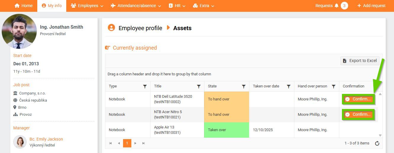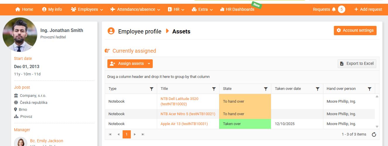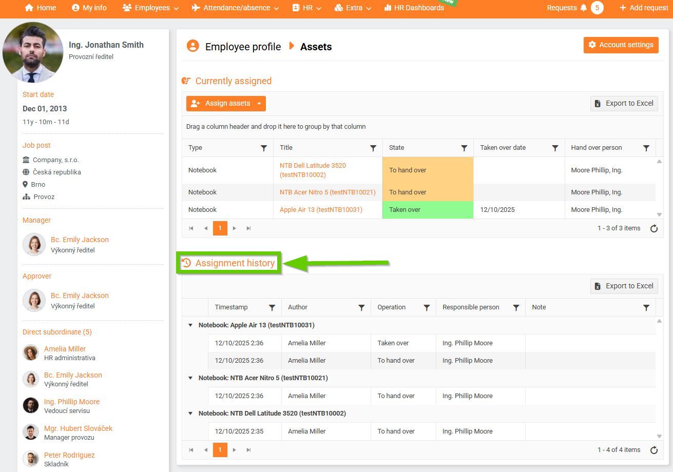 To view a list of an employee's assigned assets, go to Employee Profile > Assets > Currently Assigned . Assets that have been taken over are marked in green, and assets that are due for takeover or return are marked in yellow. (5)