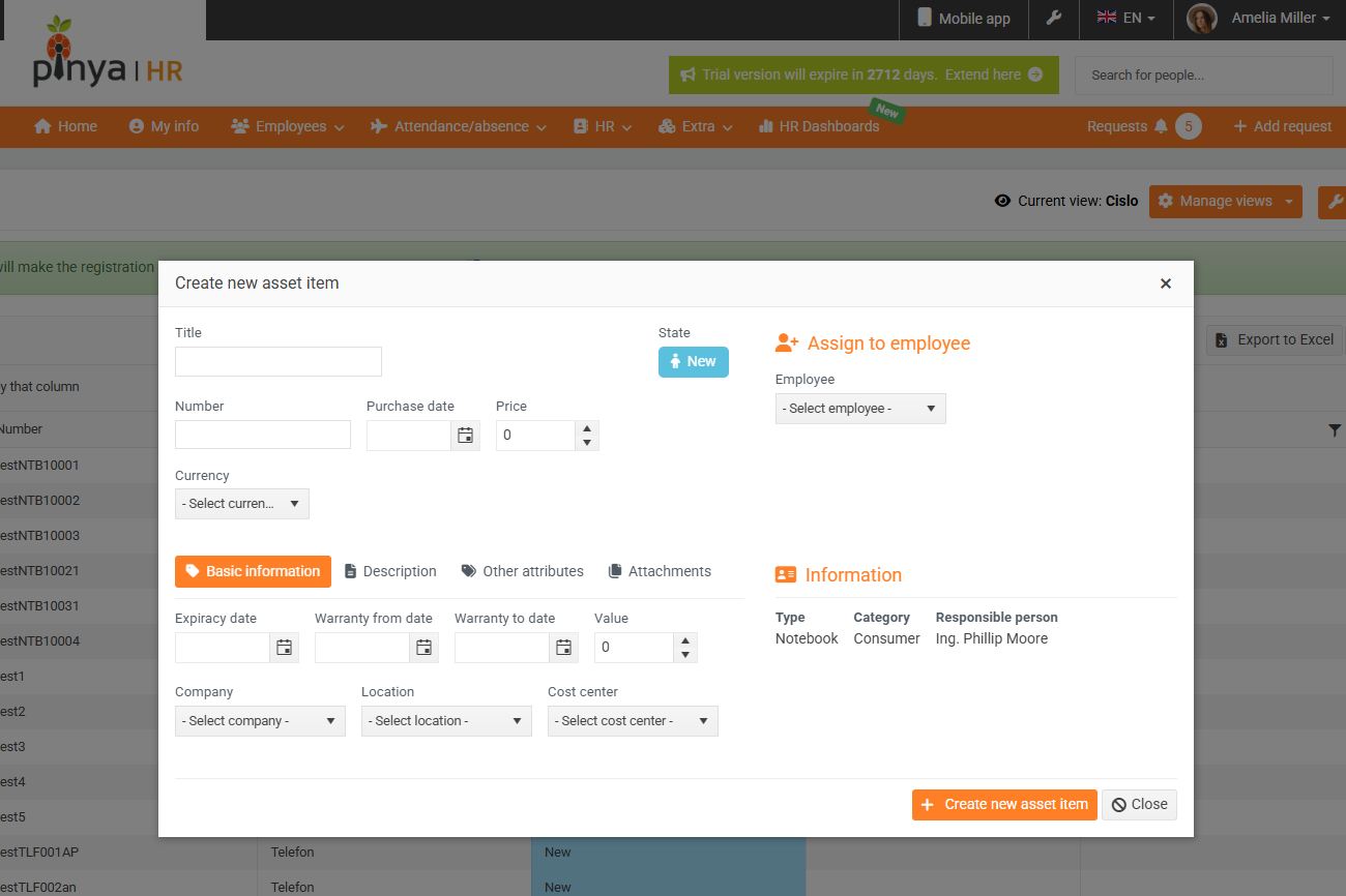 Here the administrator can edit the assets assigned to the employee and start the return process. By clicking on the Name , the administrator opens the asset item detail and can edit it. (7)