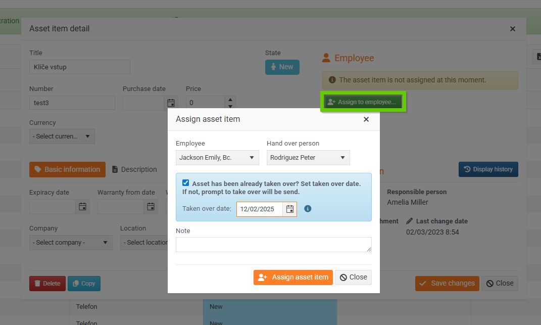 - If the employee has already taken possession of the asset, check the box and fill in the date of taking possession. In this case, the employee will not receive a call to take possession and the asset item will already be in the Taken status.
