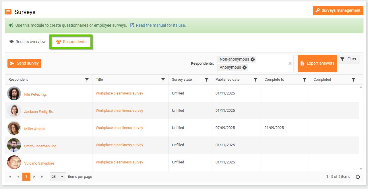 a) On the main page of the Surveys module, there are two tabs: Surveys and Respondants.