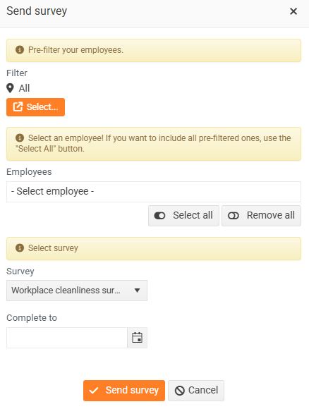 Under the Send survey button, select the employees, choose the survey, set the completion deadline, and click Send survey .