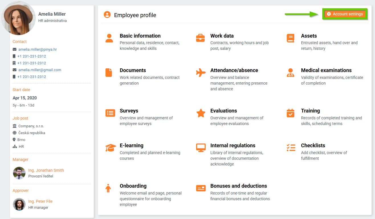 - To set the language version for an employee, go to their profile and click Account Settings .