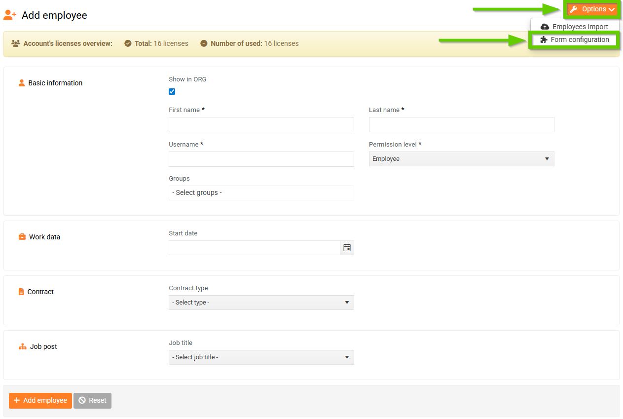 To configure the form, go to Employees > Add employee tab in the main navigation menu.
