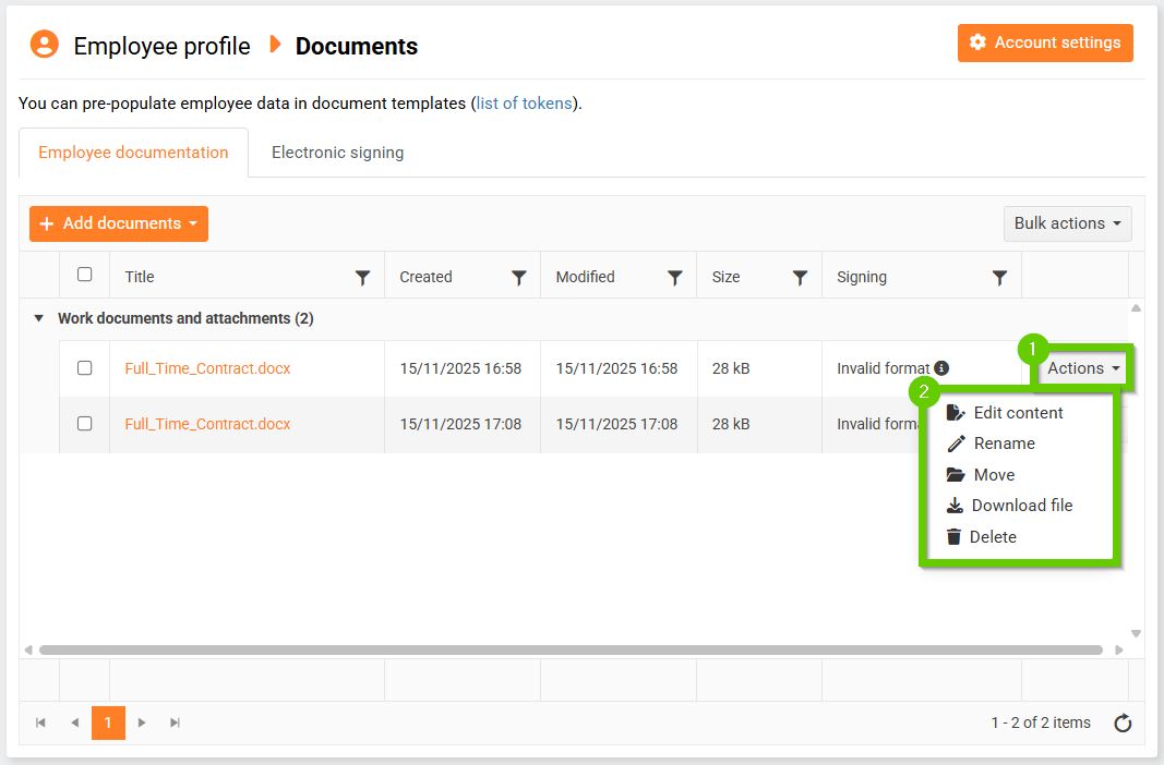 After uploading or generating a document, you can continue working with the file using the Actions button.