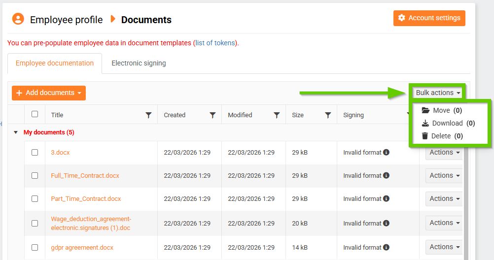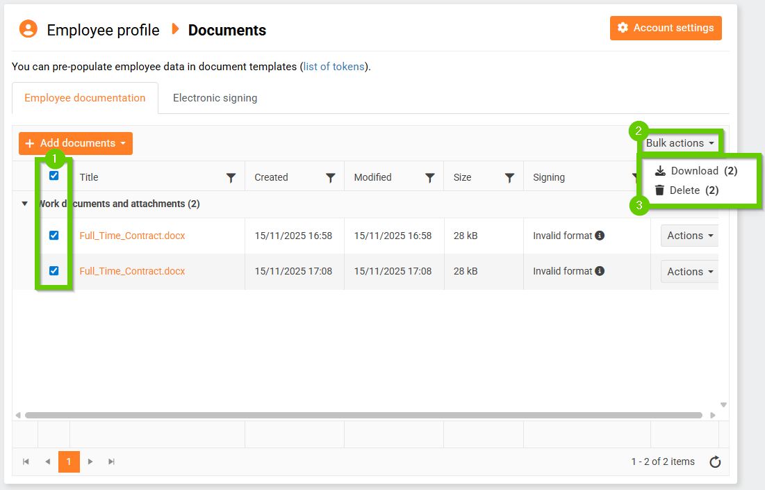 In the Documents section on an employee’s profile, you can bulk-download or delete selected documents.