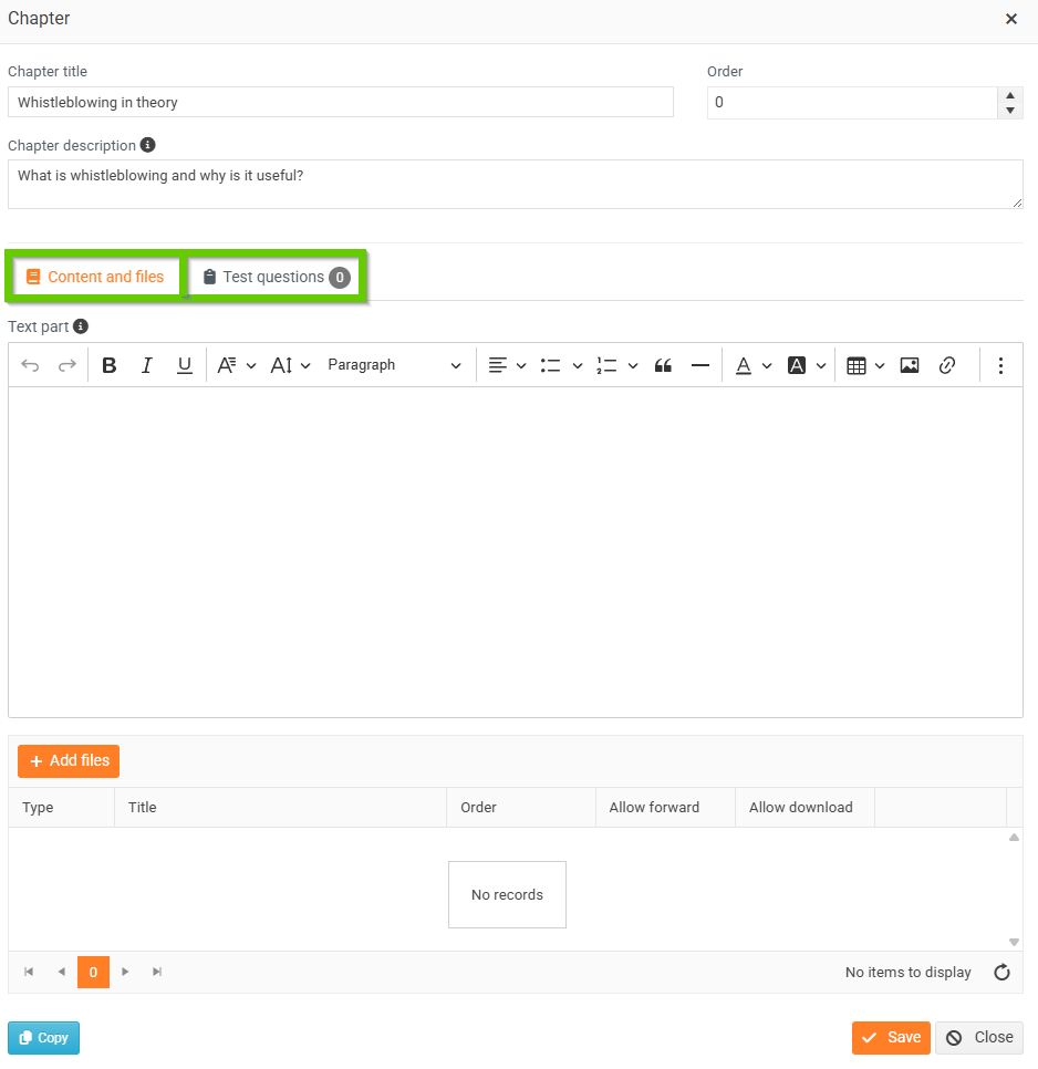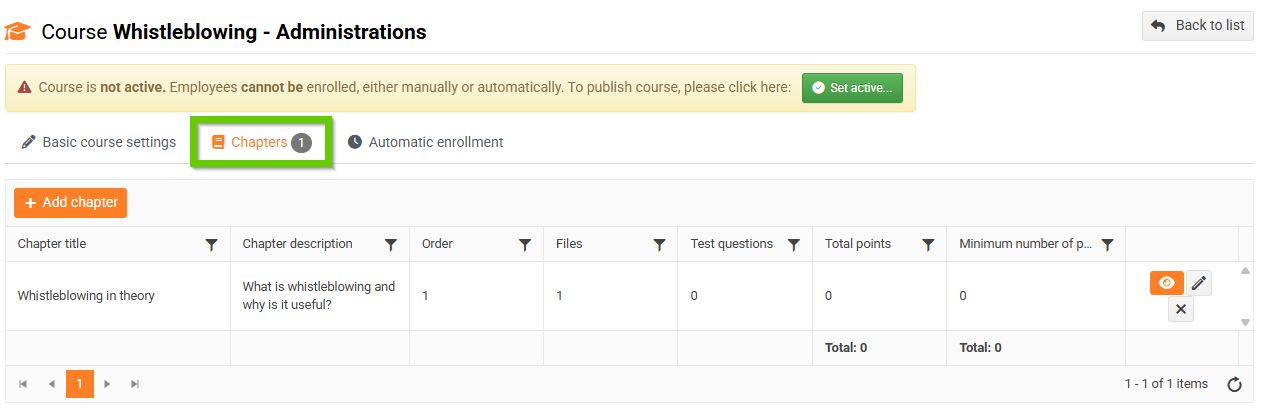 After saving the basic data, the Chapters tab will open, where you can add individual course chapters and test questions.