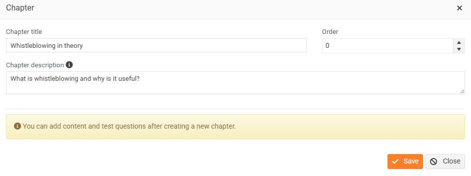 - Order - a number indicating the order in which the chapters will be displayed to course participants. If you do not fill in the order or if there are multiple chapters with the same sequence number, the chapters will be displayed in the order in which they were created.